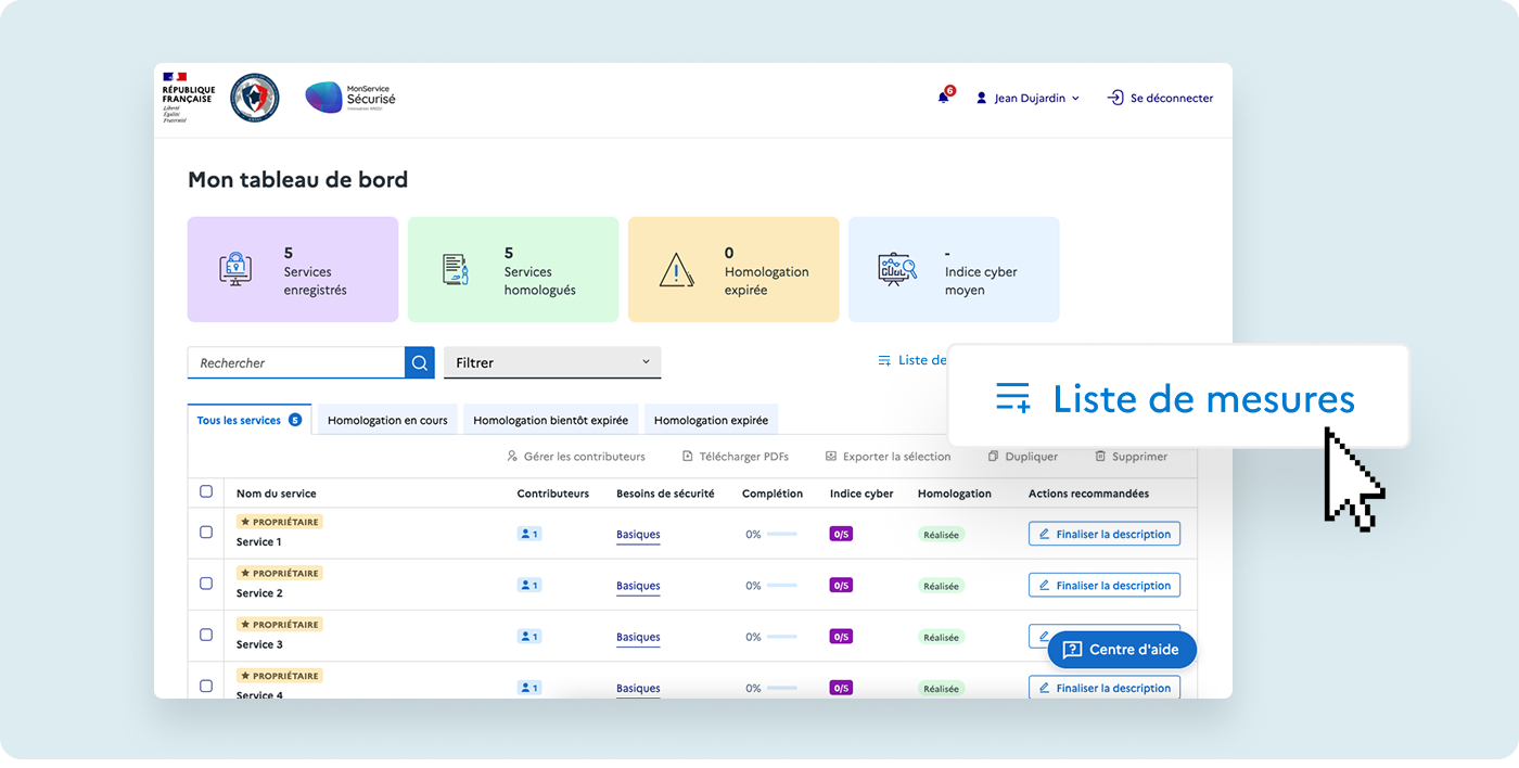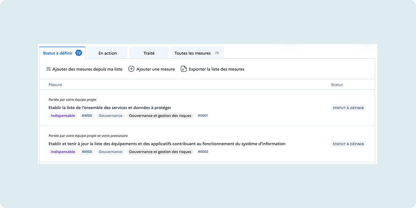 Accédez désormais à l’ensemble des mesures du référentiel ANSSI et CNIL dans une liste unique et centralisée. Cliquez sur "Liste de mesures" depuis votre tableau de bord.